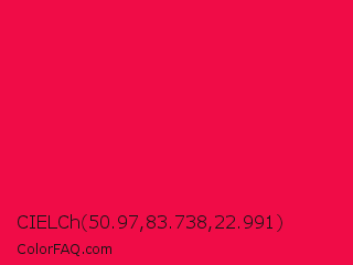 CIELCh 50.97,83.738,22.991 Color is a normal rose color and the nearest color is Red Ribbon #ed0a3f. Hex code #f00c47 and RGB value is rgb(240,12,71). In RGB color space, this color is composed of 94% red, 5% green, 28% blue, In CMYK color space, this color is composed of 0% cyan, 95% magenta, 70% yellow , 6% black , In HSL color space, this color has a hue angle of 344° , 90% saturation and 49% lightness.