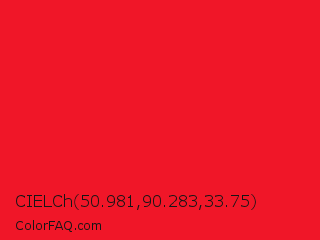 CIELCh 50.981,90.283,33.75 Color is a normal red color and the nearest color is Red Pigment #ed1c24. Hex code #f01628 and RGB value is rgb(240,22,40). In RGB color space, this color is composed of 94% red, 9% green, 16% blue, In CMYK color space, this color is composed of 0% cyan, 91% magenta, 83% yellow , 6% black , In HSL color space, this color has a hue angle of 355° , 88% saturation and 51% lightness.