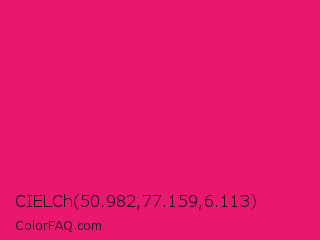 CIELCh 50.982,77.159,6.113 Color is a normal rose color and the nearest color is Razzmatazz #e3256b. Hex code #ea176f and RGB value is rgb(234,23,111). In RGB color space, this color is composed of 92% red, 9% green, 44% blue, In CMYK color space, this color is composed of 0% cyan, 90% magenta, 53% yellow , 8% black , In HSL color space, this color has a hue angle of 335° , 83% saturation and 50% lightness.