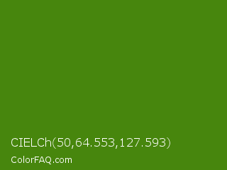 CIELCh 50,64.553,127.593 Color is a dark green color and the nearest color is Avocado #568203. Hex code #47860d and RGB value is rgb(71,134,13). In RGB color space, this color is composed of 28% red, 53% green, 5% blue, In CMYK color space, this color is composed of 47% cyan, 0% magenta, 90% yellow , 47% black , In HSL color space, this color has a hue angle of 91° , 82% saturation and 29% lightness.