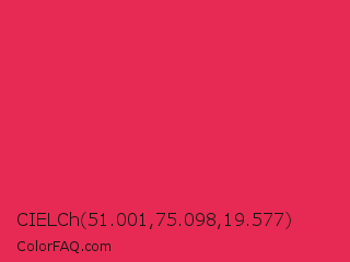 CIELCh 51.001,75.098,19.577 Color is a normal red color and the nearest color is Amaranth #e52b50. Hex code #e72a53 and RGB value is rgb(231,42,83). In RGB color space, this color is composed of 91% red, 16% green, 33% blue, In CMYK color space, this color is composed of 0% cyan, 82% magenta, 64% yellow , 9% black , In HSL color space, this color has a hue angle of 347° , 80% saturation and 54% lightness.
