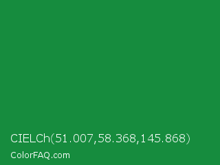 CIELCh 51.007,58.368,145.868 Color is a normal green color and the nearest color is North Texas Green #059033. Hex code #168c3e and RGB value is rgb(22,140,62). In RGB color space, this color is composed of 9% red, 55% green, 24% blue, In CMYK color space, this color is composed of 84% cyan, 0% magenta, 56% yellow , 45% black , In HSL color space, this color has a hue angle of 140° , 73% saturation and 32% lightness.
