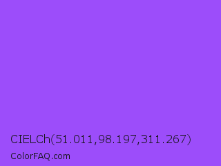 CIELCh 51.011,98.197,311.267 Color is a light violet color and the nearest color is Navy Purple #9457eb. Hex code #9c4dfa and RGB value is rgb(156,77,250). In RGB color space, this color is composed of 61% red, 30% green, 98% blue, In CMYK color space, this color is composed of 38% cyan, 69% magenta, 0% yellow , 2% black , In HSL color space, this color has a hue angle of 267° , 95% saturation and 64% lightness.