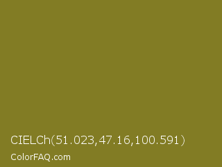 CIELCh 51.023,47.16,100.591 Color is a normal yellow color and the nearest color is Pacifika #778120. Hex code #827c24 and RGB value is rgb(130,124,36). In RGB color space, this color is composed of 51% red, 49% green, 14% blue, In CMYK color space, this color is composed of 0% cyan, 5% magenta, 72% yellow , 49% black , In HSL color space, this color has a hue angle of 56° , 57% saturation and 33% lightness.