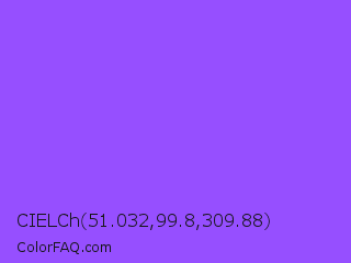 CIELCh 51.032,99.8,309.88 Color is a light violet color and the nearest color is Navy Purple #9457eb. Hex code #964fff and RGB value is rgb(150,79,255). In RGB color space, this color is composed of 59% red, 31% green, 100% blue, In CMYK color space, this color is composed of 41% cyan, 69% magenta, 0% yellow , 0% black , In HSL color space, this color has a hue angle of 264° , 100% saturation and 65% lightness.