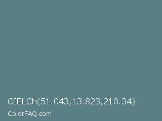 CIELCh 51.043,13.823,210.34 Color is a normal cyan color and the nearest color is Wintergreen Dream #56887d. Hex code #5a8085 and RGB value is rgb(90,128,133). In RGB color space, this color is composed of 35% red, 50% green, 52% blue, In CMYK color space, this color is composed of 32% cyan, 4% magenta, 0% yellow , 48% black , In HSL color space, this color has a hue angle of 187° , 19% saturation and 44% lightness.