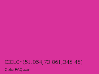 CIELCh 51.054,73.861,345.46 Color is a normal magenta color and the nearest color is Royal Fuchsia #ca2c92. Hex code #d9319b and RGB value is rgb(217,49,155). In RGB color space, this color is composed of 85% red, 19% green, 61% blue, In CMYK color space, this color is composed of 0% cyan, 77% magenta, 29% yellow , 15% black , In HSL color space, this color has a hue angle of 322° , 69% saturation and 52% lightness.