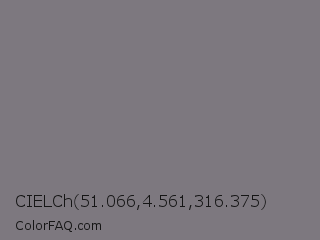 CIELCh 51.066,4.561,316.375 Color is a normal purple color and the nearest color is Jumbo #7c7b82. Hex code #7d787f and RGB value is rgb(125,120,127). In RGB color space, this color is composed of 49% red, 47% green, 50% blue, In CMYK color space, this color is composed of 2% cyan, 6% magenta, 0% yellow , 50% black , In HSL color space, this color has a hue angle of 283° , 3% saturation and 48% lightness.