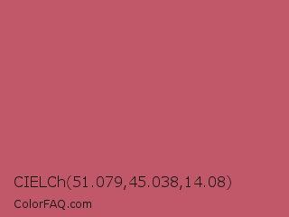 CIELCh 51.079,45.038,14.08 Color is a normal red color and the nearest color is Popstar #be4f62. Hex code #c15869 and RGB value is rgb(193,88,105). In RGB color space, this color is composed of 76% red, 35% green, 41% blue, In CMYK color space, this color is composed of 0% cyan, 54% magenta, 46% yellow , 24% black , In HSL color space, this color has a hue angle of 350° , 46% saturation and 55% lightness.