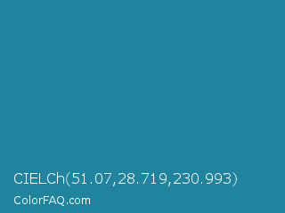 CIELCh 51.07,28.719,230.993 Color is a normal cyan color and the nearest color is Jelly Bean #297b9a. Hex code #21849f and RGB value is rgb(33,132,159). In RGB color space, this color is composed of 13% red, 52% green, 62% blue, In CMYK color space, this color is composed of 79% cyan, 17% magenta, 0% yellow , 38% black , In HSL color space, this color has a hue angle of 193° , 66% saturation and 38% lightness.
