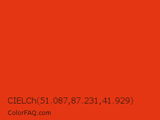 CIELCh 51.087,87.231,41.929 Color is a normal red color and the nearest color is Vermilion #d9381e. Hex code #e53613 and RGB value is rgb(229,54,19). In RGB color space, this color is composed of 90% red, 21% green, 7% blue, In CMYK color space, this color is composed of 0% cyan, 76% magenta, 92% yellow , 10% black , In HSL color space, this color has a hue angle of 10° , 85% saturation and 49% lightness.