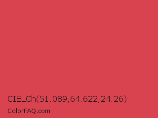 CIELCh 51.089,64.622,24.26 Color is a normal red color and the nearest color is English Vermillion #cc474b. Hex code #d94350 and RGB value is rgb(217,67,80). In RGB color space, this color is composed of 85% red, 26% green, 31% blue, In CMYK color space, this color is composed of 0% cyan, 69% magenta, 63% yellow , 15% black , In HSL color space, this color has a hue angle of 355° , 66% saturation and 56% lightness.