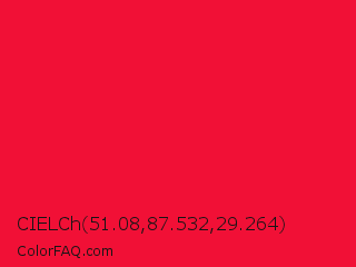 CIELCh 51.08,87.532,29.264 Color is a normal red color and the nearest color is Red Ribbon #ed0a3f. Hex code #f11036 and RGB value is rgb(241,16,54). In RGB color space, this color is composed of 95% red, 6% green, 21% blue, In CMYK color space, this color is composed of 0% cyan, 93% magenta, 78% yellow , 5% black , In HSL color space, this color has a hue angle of 350° , 89% saturation and 50% lightness.