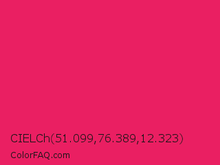 CIELCh 51.099,76.389,12.323 Color is a normal rose color and the nearest color is Razzmatazz #e3256b. Hex code #ea1f62 and RGB value is rgb(234,31,98). In RGB color space, this color is composed of 92% red, 12% green, 38% blue, In CMYK color space, this color is composed of 0% cyan, 87% magenta, 58% yellow , 8% black , In HSL color space, this color has a hue angle of 340° , 83% saturation and 52% lightness.