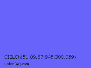 CIELCh 51.09,87.945,300.059 Color is a light indigo color and the nearest color is Very Light Blue #6666ff. Hex code #6765fe and RGB value is rgb(103,101,254). In RGB color space, this color is composed of 40% red, 40% green, 100% blue, In CMYK color space, this color is composed of 59% cyan, 60% magenta, 0% yellow , 0% black , In HSL color space, this color has a hue angle of 241° , 99% saturation and 70% lightness.