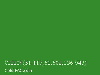 CIELCh 51.117,61.601,136.943 Color is a normal green color and the nearest color is Forest Green #228b22. Hex code #348b2b and RGB value is rgb(52,139,43). In RGB color space, this color is composed of 20% red, 55% green, 17% blue, In CMYK color space, this color is composed of 63% cyan, 0% magenta, 69% yellow , 45% black , In HSL color space, this color has a hue angle of 114° , 53% saturation and 36% lightness.