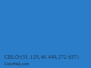 CIELCh 51.125,46.449,272.657 Color is a normal blue color and the nearest color is Mariner #286acd. Hex code #2a7dc9 and RGB value is rgb(42,125,201). In RGB color space, this color is composed of 16% red, 49% green, 79% blue, In CMYK color space, this color is composed of 79% cyan, 38% magenta, 0% yellow , 21% black , In HSL color space, this color has a hue angle of 209° , 65% saturation and 48% lightness.