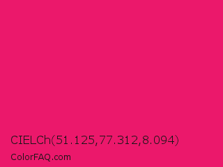 CIELCh 51.125,77.312,8.094 Color is a normal rose color and the nearest color is Razzmatazz #e3256b. Hex code #eb186b and RGB value is rgb(235,24,107). In RGB color space, this color is composed of 92% red, 9% green, 42% blue, In CMYK color space, this color is composed of 0% cyan, 90% magenta, 54% yellow , 8% black , In HSL color space, this color has a hue angle of 336° , 84% saturation and 51% lightness.