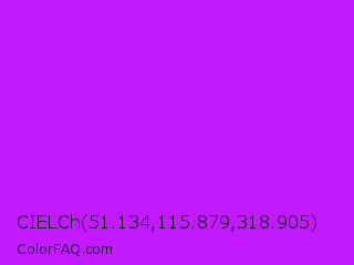 CIELCh 51.134,115.879,318.905 Color is a normal purple color and the nearest color is Electric Purple #bf00ff. Hex code #c219ff and RGB value is rgb(194,25,255). In RGB color space, this color is composed of 76% red, 10% green, 100% blue, In CMYK color space, this color is composed of 24% cyan, 90% magenta, 0% yellow , 0% black , In HSL color space, this color has a hue angle of 284° , 100% saturation and 55% lightness.