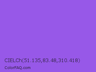 CIELCh 51.135,83.48,310.418 Color is a light violet color and the nearest color is Navy Purple #9457eb. Hex code #9758e8 and RGB value is rgb(151,88,232). In RGB color space, this color is composed of 59% red, 35% green, 91% blue, In CMYK color space, this color is composed of 35% cyan, 62% magenta, 0% yellow , 9% black , In HSL color space, this color has a hue angle of 266° , 76% saturation and 63% lightness.