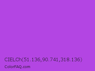 CIELCh 51.136,90.741,318.136 Color is a normal purple color and the nearest color is Medium Orchid #ba55d3. Hex code #b345e3 and RGB value is rgb(179,69,227). In RGB color space, this color is composed of 70% red, 27% green, 89% blue, In CMYK color space, this color is composed of 21% cyan, 70% magenta, 0% yellow , 11% black , In HSL color space, this color has a hue angle of 282° , 74% saturation and 58% lightness.
