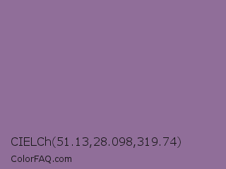 CIELCh 51.13,28.098,319.74 Color is a normal purple color and the nearest color is Trendy Pink #8c6495. Hex code #906e99 and RGB value is rgb(144,110,153). In RGB color space, this color is composed of 56% red, 43% green, 60% blue, In CMYK color space, this color is composed of 6% cyan, 28% magenta, 0% yellow , 40% black , In HSL color space, this color has a hue angle of 287° , 17% saturation and 52% lightness.