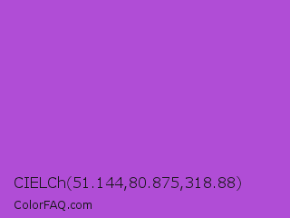 CIELCh 51.144,80.875,318.88 Color is a normal purple color and the nearest color is Medium Orchid #ba55d3. Hex code #b04dd6 and RGB value is rgb(176,77,214). In RGB color space, this color is composed of 69% red, 30% green, 84% blue, In CMYK color space, this color is composed of 18% cyan, 64% magenta, 0% yellow , 16% black , In HSL color space, this color has a hue angle of 283° , 63% saturation and 57% lightness.