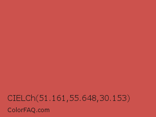 CIELCh 51.161,55.648,30.153 Color is a normal red color and the nearest color is Cedar Chest #c95a49. Hex code #cc524d and RGB value is rgb(204,82,77). In RGB color space, this color is composed of 80% red, 32% green, 30% blue, In CMYK color space, this color is composed of 0% cyan, 60% magenta, 62% yellow , 20% black , In HSL color space, this color has a hue angle of 2° , 55% saturation and 55% lightness.