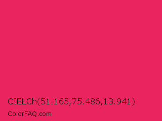 CIELCh 51.165,75.486,13.941 Color is a normal rose color and the nearest color is Razzmatazz #e3256b. Hex code #e9245f and RGB value is rgb(233,36,95). In RGB color space, this color is composed of 91% red, 14% green, 37% blue, In CMYK color space, this color is composed of 0% cyan, 85% magenta, 59% yellow , 9% black , In HSL color space, this color has a hue angle of 342° , 82% saturation and 53% lightness.