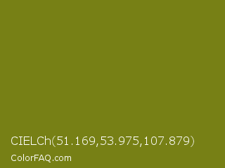 CIELCh 51.169,53.975,107.879 Color is a dark yellow color and the nearest color is Trendy Green #7c881a. Hex code #778015 and RGB value is rgb(119,128,21). In RGB color space, this color is composed of 47% red, 50% green, 8% blue, In CMYK color space, this color is composed of 7% cyan, 0% magenta, 84% yellow , 50% black , In HSL color space, this color has a hue angle of 65° , 72% saturation and 29% lightness.