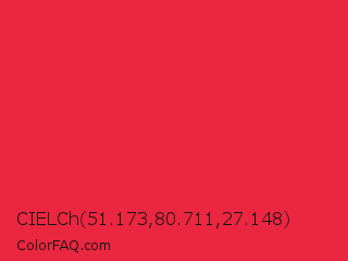 CIELCh 51.173,80.711,27.148 Color is a normal red color and the nearest color is Imperial Red #ed2939. Hex code #eb2640 and RGB value is rgb(235,38,64). In RGB color space, this color is composed of 92% red, 15% green, 25% blue, In CMYK color space, this color is composed of 0% cyan, 84% magenta, 73% yellow , 8% black , In HSL color space, this color has a hue angle of 352° , 83% saturation and 54% lightness.