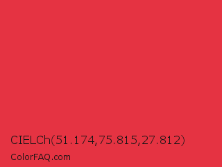 CIELCh 51.174,75.815,27.812 Color is a normal red color and the nearest color is Rusty Red #da2c43. Hex code #e53342 and RGB value is rgb(229,51,66). In RGB color space, this color is composed of 90% red, 20% green, 26% blue, In CMYK color space, this color is composed of 0% cyan, 78% magenta, 71% yellow , 10% black , In HSL color space, this color has a hue angle of 355° , 77% saturation and 55% lightness.