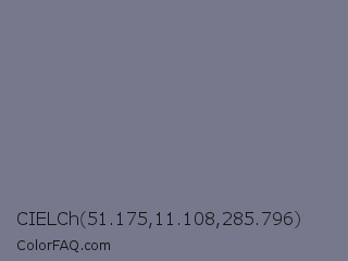 CIELCh 51.175,11.108,285.796 Color is a normal blue color and the nearest color is Raven #727b89. Hex code #76798c and RGB value is rgb(118,121,140). In RGB color space, this color is composed of 46% red, 47% green, 55% blue, In CMYK color space, this color is composed of 16% cyan, 14% magenta, 0% yellow , 45% black , In HSL color space, this color has a hue angle of 232° , 9% saturation and 51% lightness.