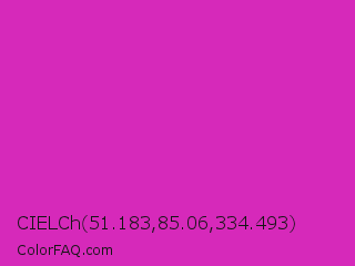 CIELCh 51.183,85.06,334.493 Color is a normal magenta color and the nearest color is Steel Pink #cc33cc. Hex code #d629ba and RGB value is rgb(214,41,186). In RGB color space, this color is composed of 84% red, 16% green, 73% blue, In CMYK color space, this color is composed of 0% cyan, 81% magenta, 13% yellow , 16% black , In HSL color space, this color has a hue angle of 310° , 68% saturation and 50% lightness.