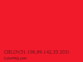 CIELCh 51.196,89.142,33.203 Color is a normal red color and the nearest color is Red Pigment #ed1c24. Hex code #f01a2b and RGB value is rgb(240,26,43). In RGB color space, this color is composed of 94% red, 10% green, 17% blue, In CMYK color space, this color is composed of 0% cyan, 89% magenta, 82% yellow , 6% black , In HSL color space, this color has a hue angle of 355° , 88% saturation and 52% lightness.