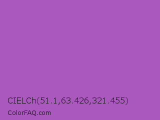 CIELCh 51.1,63.426,321.455 Color is a normal purple color and the nearest color is Purple Plum #9c51b6. Hex code #ab58be and RGB value is rgb(171,88,190). In RGB color space, this color is composed of 67% red, 35% green, 75% blue, In CMYK color space, this color is composed of 10% cyan, 54% magenta, 0% yellow , 25% black , In HSL color space, this color has a hue angle of 289° , 44% saturation and 55% lightness.