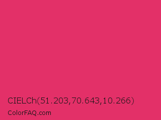 CIELCh 51.203,70.643,10.266 Color is a normal rose color and the nearest color is Cerise Red #de3163. Hex code #e33068 and RGB value is rgb(227,48,104). In RGB color space, this color is composed of 89% red, 19% green, 41% blue, In CMYK color space, this color is composed of 0% cyan, 79% magenta, 54% yellow , 11% black , In HSL color space, this color has a hue angle of 341° , 76% saturation and 54% lightness.
