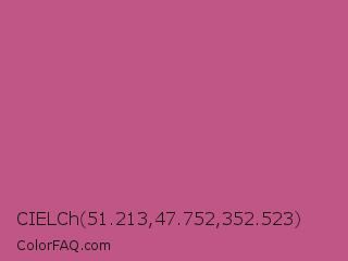 CIELCh 51.213,47.752,352.523 Color is a normal rose color and the nearest color is Mulberry #c54b8c. Hex code #bf5686 and RGB value is rgb(191,86,134). In RGB color space, this color is composed of 75% red, 34% green, 53% blue, In CMYK color space, this color is composed of 0% cyan, 55% magenta, 30% yellow , 25% black , In HSL color space, this color has a hue angle of 333° , 45% saturation and 54% lightness.