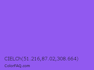 CIELCh 51.216,87.02,308.664 Color is a light violet color and the nearest color is Navy Purple #9457eb. Hex code #9159f0 and RGB value is rgb(145,89,240). In RGB color space, this color is composed of 57% red, 35% green, 94% blue, In CMYK color space, this color is composed of 40% cyan, 63% magenta, 0% yellow , 6% black , In HSL color space, this color has a hue angle of 262° , 83% saturation and 65% lightness.