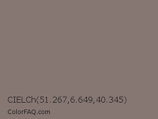 CIELCh 51.267,6.649,40.345 Color is a normal red color and the nearest color is Americano #87756e. Hex code #867773 and RGB value is rgb(134,119,115). In RGB color space, this color is composed of 53% red, 47% green, 45% blue, In CMYK color space, this color is composed of 0% cyan, 11% magenta, 14% yellow , 47% black , In HSL color space, this color has a hue angle of 13° , 8% saturation and 49% lightness.