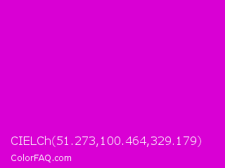 CIELCh 51.273,100.464,329.179 Color is a normal magenta color and the nearest color is Deep Magenta #cc00cc. Hex code #d900d4 and RGB value is rgb(217,0,212). In RGB color space, this color is composed of 85% red, 0% green, 83% blue, In CMYK color space, this color is composed of 0% cyan, 100% magenta, 2% yellow , 15% black , In HSL color space, this color has a hue angle of 301° , 100% saturation and 43% lightness.