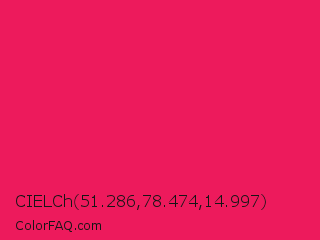 CIELCh 51.286,78.474,14.997 Color is a normal rose color and the nearest color is Ruby #e0115f. Hex code #ed1a5c and RGB value is rgb(237,26,92). In RGB color space, this color is composed of 93% red, 10% green, 36% blue, In CMYK color space, this color is composed of 0% cyan, 89% magenta, 61% yellow , 7% black , In HSL color space, this color has a hue angle of 341° , 85% saturation and 52% lightness.