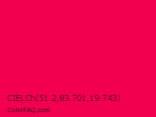 CIELCh 51.2,83.701,19.743 Color is a normal rose color and the nearest color is Folly #ff004f. Hex code #f2004f and RGB value is rgb(242,0,79). In RGB color space, this color is composed of 95% red, 0% green, 31% blue, In CMYK color space, this color is composed of 0% cyan, 100% magenta, 67% yellow , 5% black , In HSL color space, this color has a hue angle of 340° , 100% saturation and 47% lightness.
