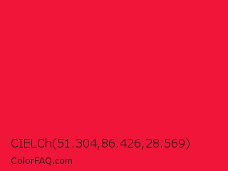 CIELCh 51.304,86.426,28.569 Color is a normal red color and the nearest color is Red Ribbon #ed0a3f. Hex code #f11539 and RGB value is rgb(241,21,57). In RGB color space, this color is composed of 95% red, 8% green, 22% blue, In CMYK color space, this color is composed of 0% cyan, 91% magenta, 76% yellow , 5% black , In HSL color space, this color has a hue angle of 350° , 89% saturation and 51% lightness.