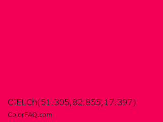 CIELCh 51.305,82.855,17.397 Color is a normal rose color and the nearest color is Folly #ff004f. Hex code #f20055 and RGB value is rgb(242,0,85). In RGB color space, this color is composed of 95% red, 0% green, 33% blue, In CMYK color space, this color is composed of 0% cyan, 100% magenta, 65% yellow , 5% black , In HSL color space, this color has a hue angle of 339° , 100% saturation and 47% lightness.
