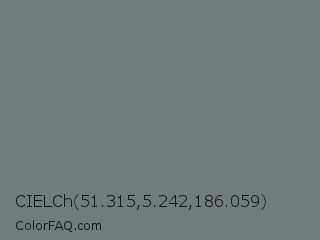 CIELCh 51.315,5.242,186.059 Color is a normal cyan color and the nearest color is Aurometalsaurus #6e7f80. Hex code #707d7b and RGB value is rgb(112,125,123). In RGB color space, this color is composed of 44% red, 49% green, 48% blue, In CMYK color space, this color is composed of 10% cyan, 0% magenta, 2% yellow , 51% black , In HSL color space, this color has a hue angle of 171° , 5% saturation and 46% lightness.