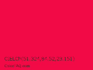 CIELCh 51.324,84.52,23.151 Color is a normal rose color and the nearest color is Red Ribbon #ed0a3f. Hex code #f20a47 and RGB value is rgb(242,10,71). In RGB color space, this color is composed of 95% red, 4% green, 28% blue, In CMYK color space, this color is composed of 0% cyan, 96% magenta, 71% yellow , 5% black , In HSL color space, this color has a hue angle of 344° , 92% saturation and 49% lightness.