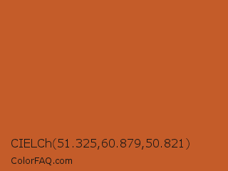 CIELCh 51.325,60.879,50.821 Color is a normal orange color and the nearest color is Tuscany #bd5e2e. Hex code #c45c29 and RGB value is rgb(196,92,41). In RGB color space, this color is composed of 77% red, 36% green, 16% blue, In CMYK color space, this color is composed of 0% cyan, 53% magenta, 79% yellow , 23% black , In HSL color space, this color has a hue angle of 20° , 65% saturation and 46% lightness.