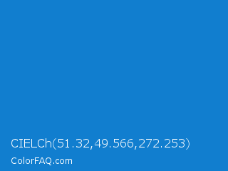 CIELCh 51.32,49.566,272.253 Color is a normal blue color and the nearest color is Bright Navy Blue #1974d2. Hex code #117ecf and RGB value is rgb(17,126,207). In RGB color space, this color is composed of 7% red, 49% green, 81% blue, In CMYK color space, this color is composed of 92% cyan, 39% magenta, 0% yellow , 19% black , In HSL color space, this color has a hue angle of 206° , 85% saturation and 44% lightness.