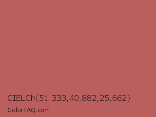 CIELCh 51.333,40.882,25.662 Color is a normal red color and the nearest color is Matrix #b05d54. Hex code #bb5f5e and RGB value is rgb(187,95,94). In RGB color space, this color is composed of 73% red, 37% green, 37% blue, In CMYK color space, this color is composed of 0% cyan, 49% magenta, 50% yellow , 27% black , In HSL color space, this color has a hue angle of 1° , 41% saturation and 55% lightness.